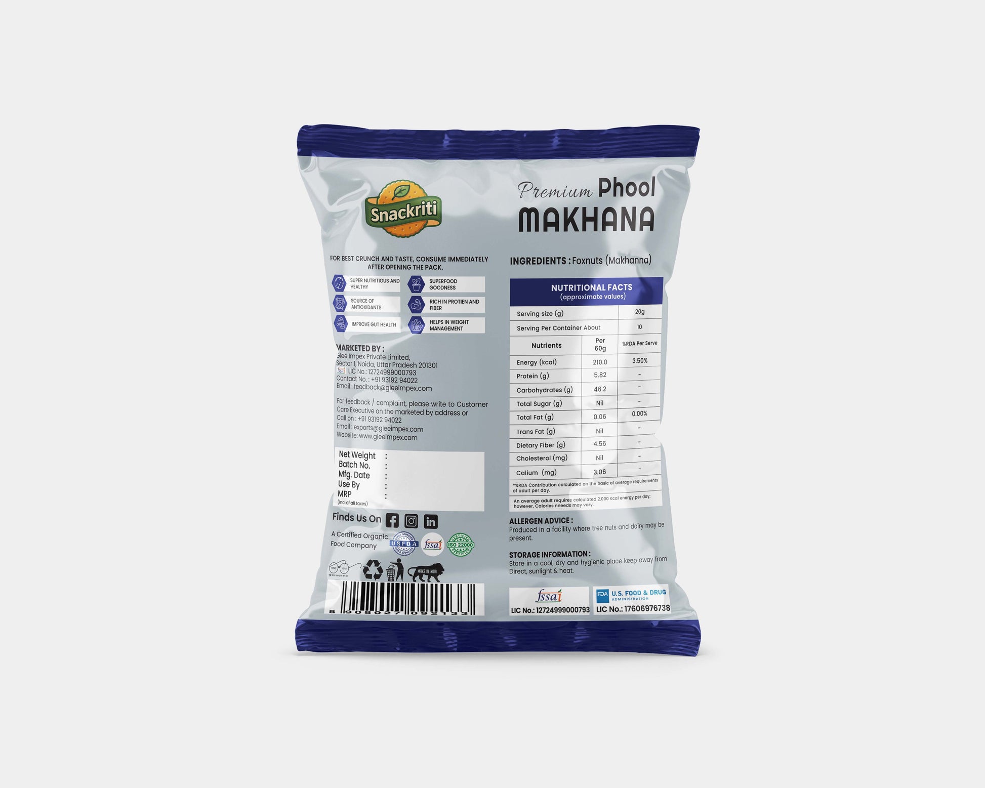 Naturally low in fat and rich in protein, fiber, and essential minerals, Snackriti Raw Makhana supports a balanced lifestyle and mindful eating. Its light texture and neutral taste make it a versatile ingredient for snacks, curries, kheer, fasting meals, and fitness diets.