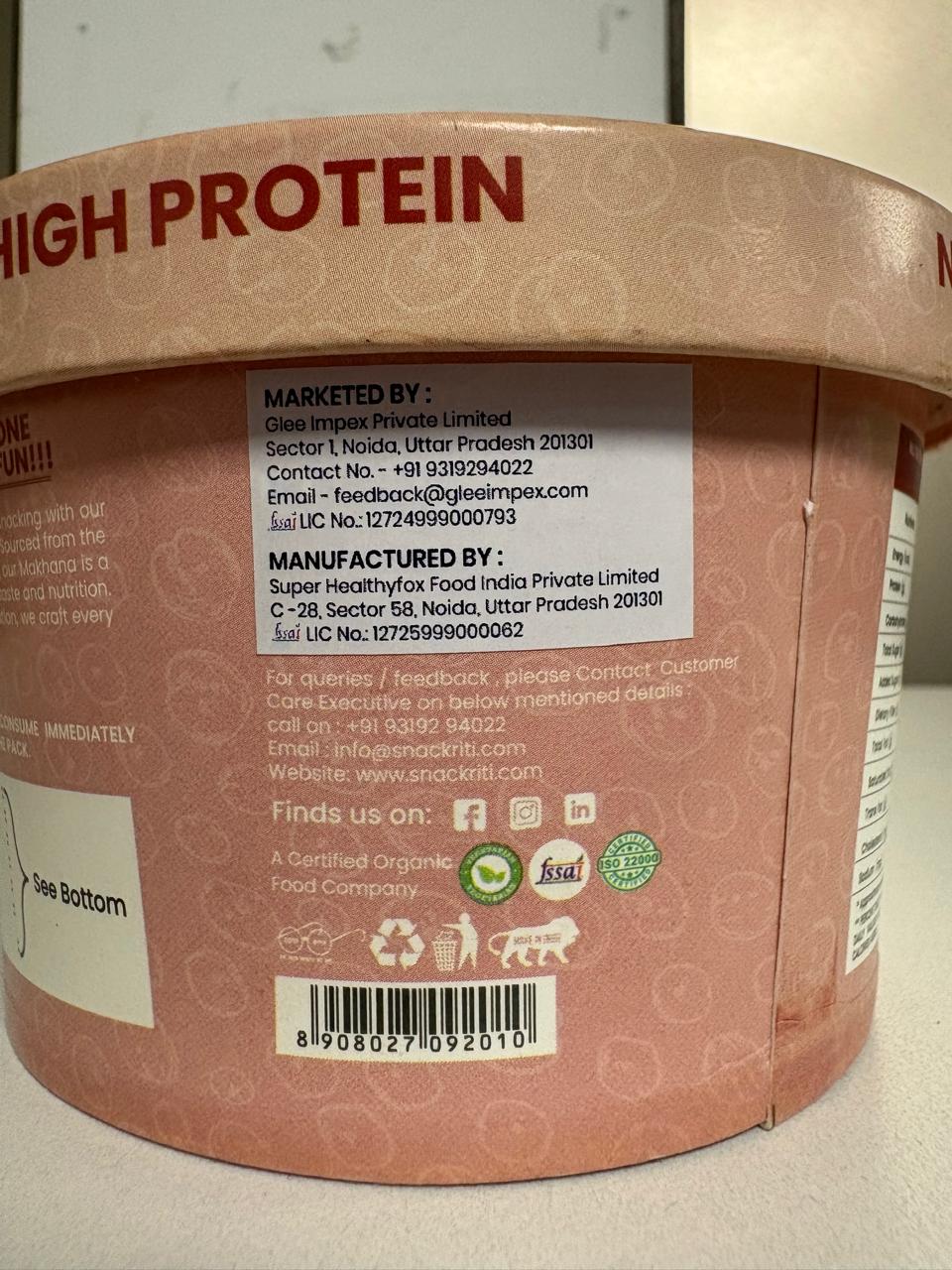Roasted Makhana, Rice Bran Oil, Sugar, Maltodextrin, Salt, Dehydrated Vegetable Powders (Onion, Garlic), Food Acids (INS 330, INS 296), Sodium Salt (INS 262(ii)), Spices & Spice Extracts (Chilli, Cumin, Black Pepper & Clove), Hydrolysed Vegetable Protein, Paprika Extract (INS 160c), Anti-Caking Agents (INS 341(iii), INS 551), Flavour Enhancers (INS 627, INS 631), Antioxidant (INS 319). Contains added Natural and Nature Identical Flavouring Substances (Tomato).